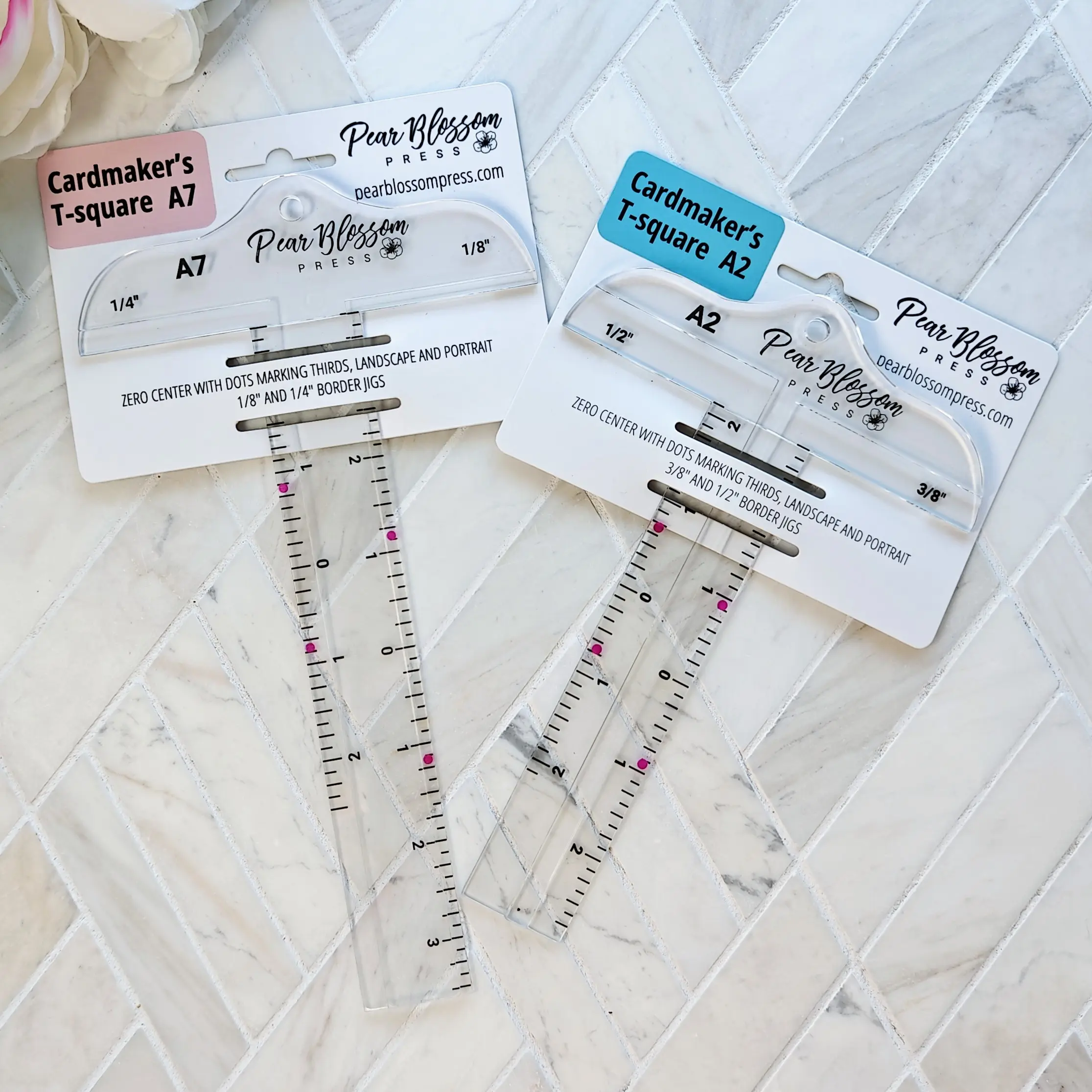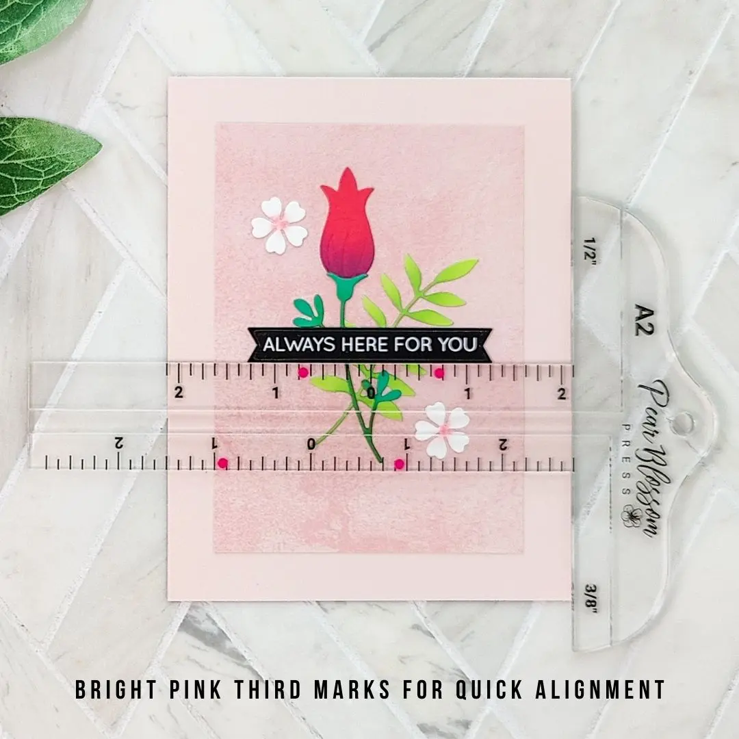 With a zero center and bright pink dots to mark thirds (both landscape and portrait), the Cardmaker’s T-square is the perfect tool for lining up images and sentiments! Available for A2 and A7 cards.