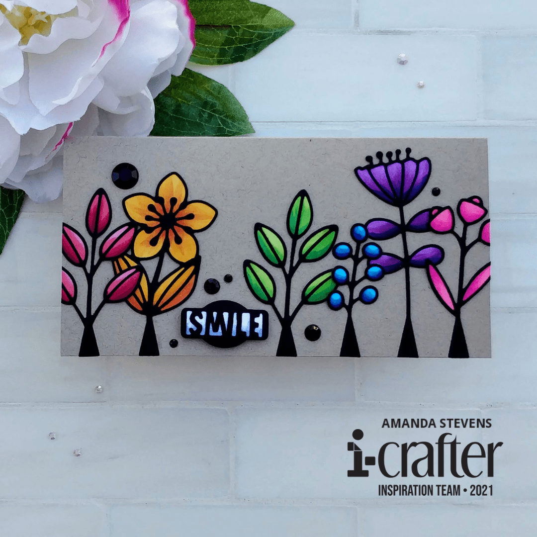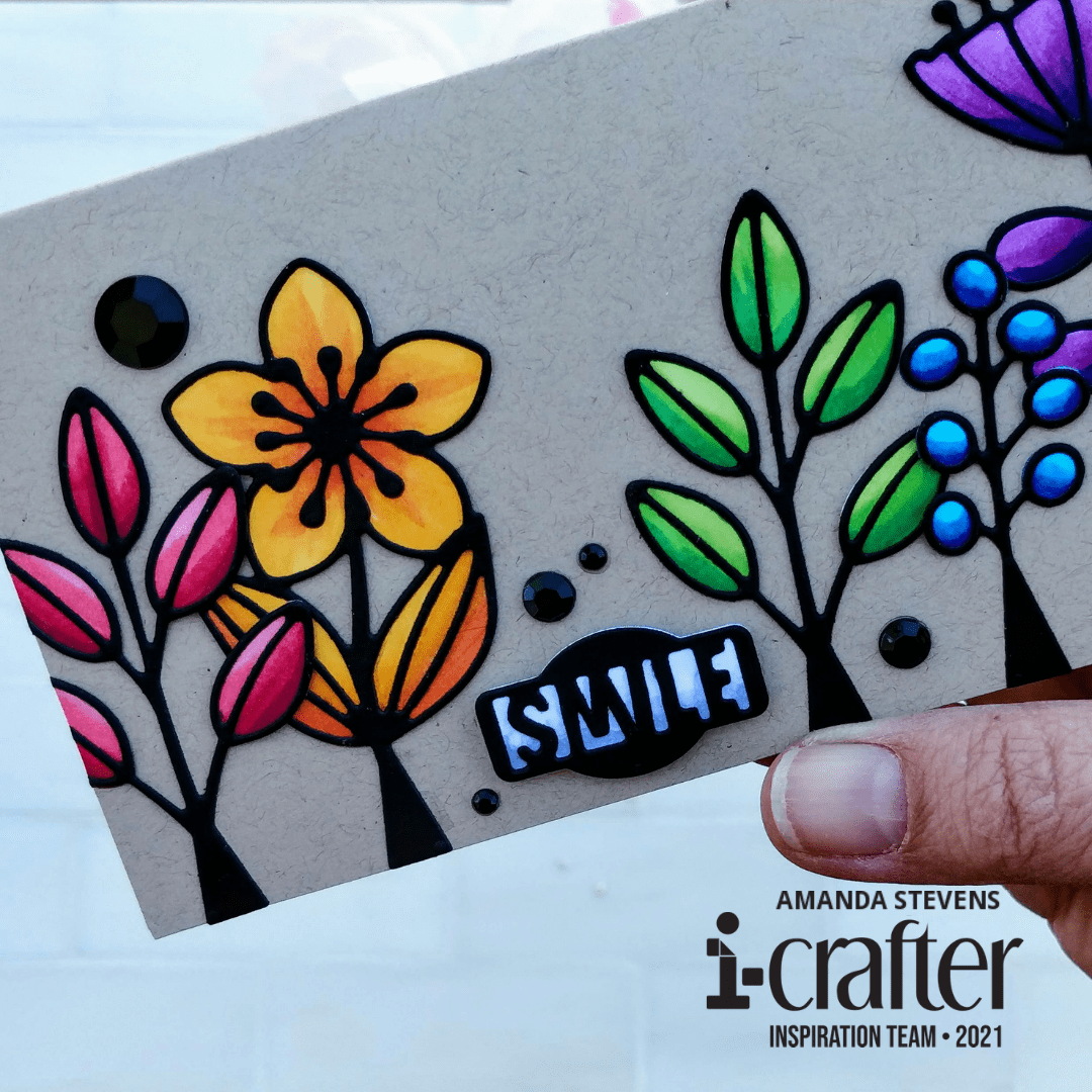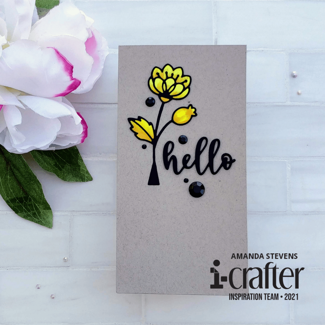 Originally, I was only going to make one card, and I wanted a colorblock rainbow effect. So I colored all of the solid pieces for each frame in the same colors (rather than green leaves and a different color for the flowers). I used three shades of Copic markers for each one, to get a nice blend. Then, I glued the solid pieces to the frames. After arranging the flowers in rainbow order on my kraft mini slimline card base, I realized two things: the orange and yellow seemed to outweigh the other colors, and I didn’t really leave myself much room for a sentiment. I decided to pull the yellow flower off, and create a second card with it. With the flowers glued to the card bases, I added sentiments. HELLO is stacked up three times; SMILE is layered onto a white base (with grey marker shading) and popped up with foam tape. A few black gems finish the cards and add some sparkle.